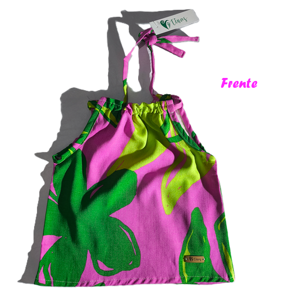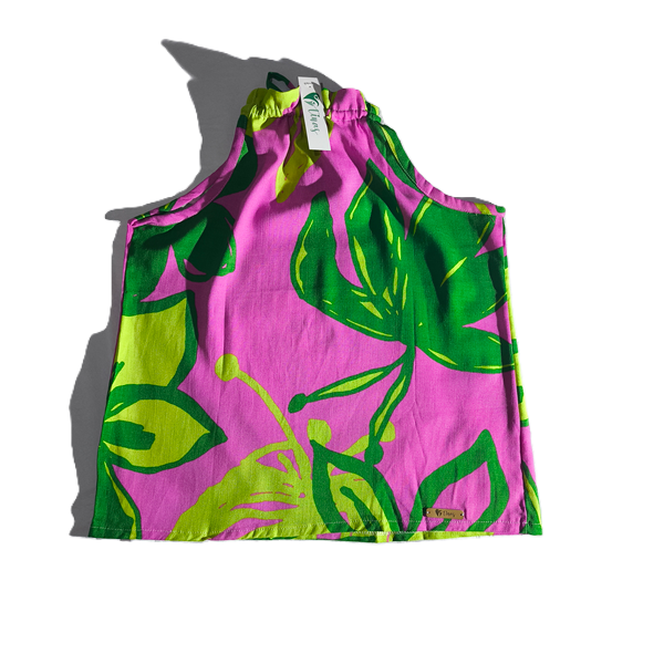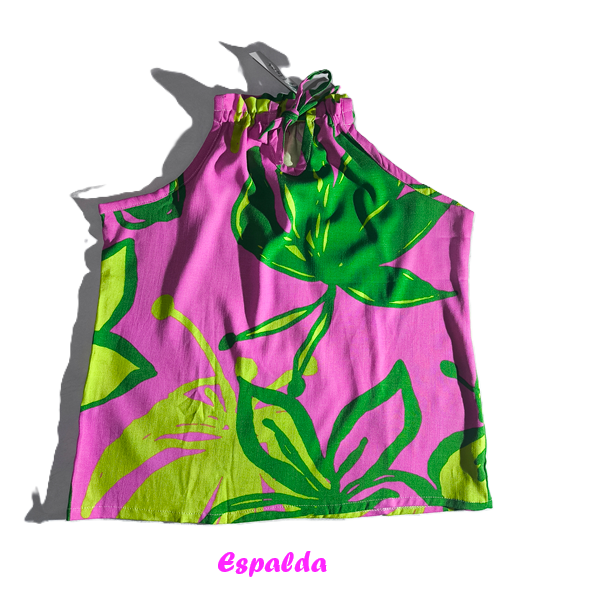 Blusa de lino estampado color fucsia con flores en distintos tonos de verde, cuello alto ajustable. Tiene una pequeña abertura en forma de gota en la parte superior trasera.