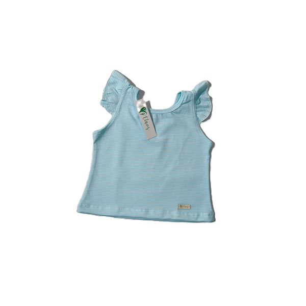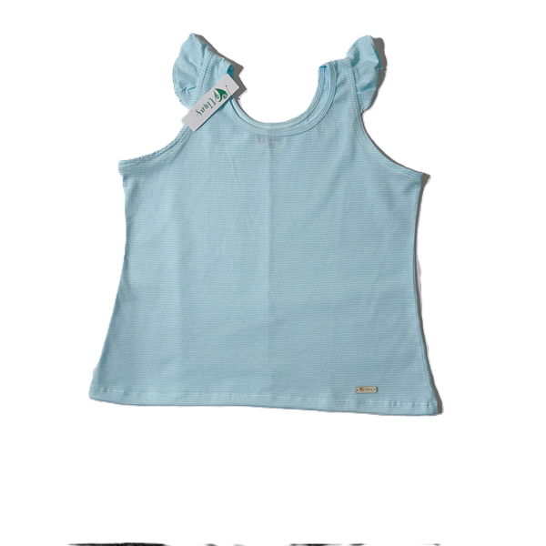 Musculosa de algodón color celeste con finas rayas blancas, tiene un pequeño volado en el bretel.