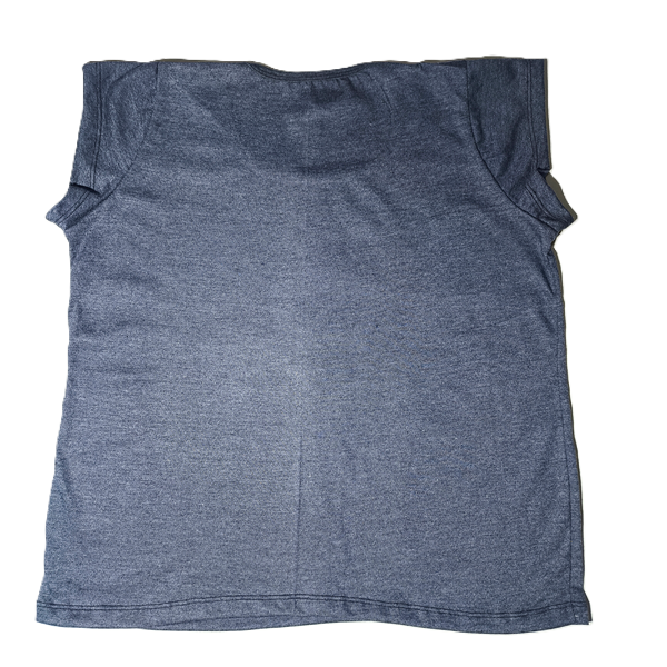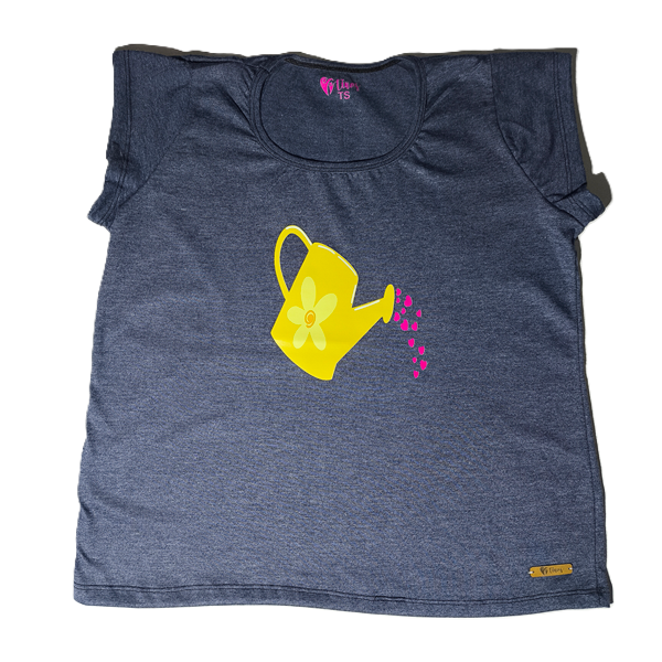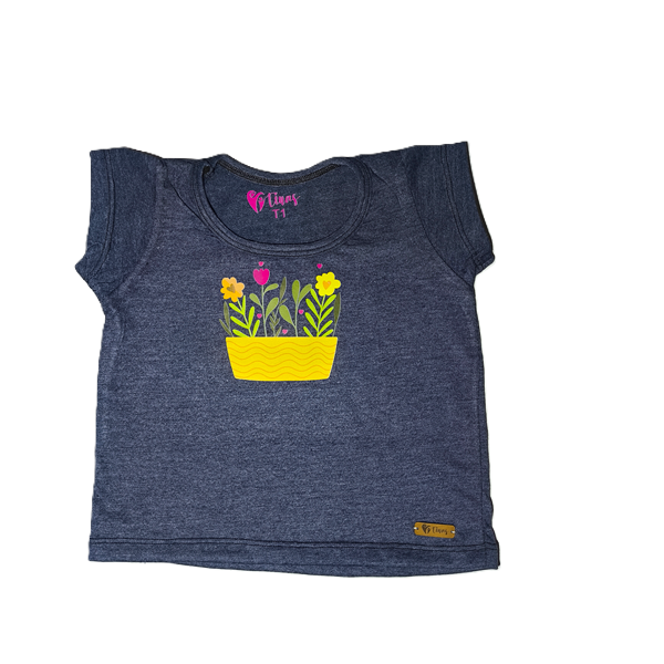 Remera manga corta de algodón color azul melange con estampa en la parte delantera de regadera en talles de adulto y estampa de maceta con flores en los talles pequeños.
