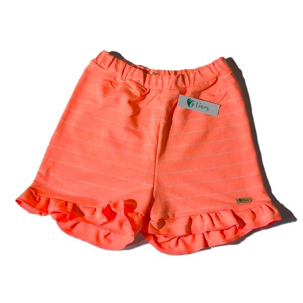 Short de jersey color naranja con finas rayas blancas, tiene elástico en la cintura y un pequeño volado en la parte inferior.